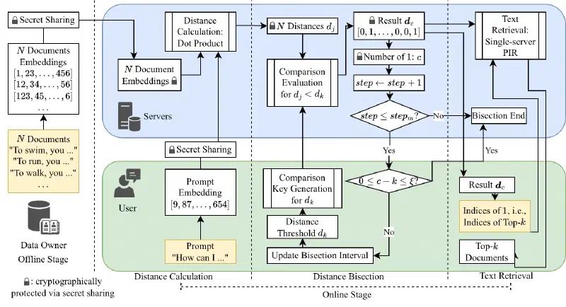 During the offline stage, the data owner sets up the secret-shared database. During the distance calculation, the servers compute the secret-shared distances between each document and the user's prompt. During the distance bisection, the user determines a distance threshold $d_k$ for the top-$k$ documents. The bisection iteration ends when $d_k$ is found, or the number of iterations exceeds an upper bound. During the text retrieval, the user retrieves textual documents using the indices of the top-$k$ documents.